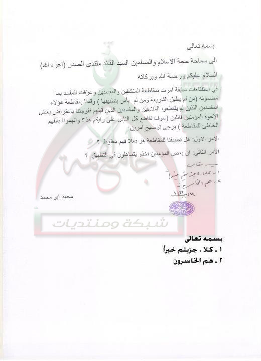 مقاطعة المفسدين والمنشقين وتماهل البعض في المقاطعة استفتاء السيد القائد مقتدى الصدر اعزه الله 5 - 6 - 2012