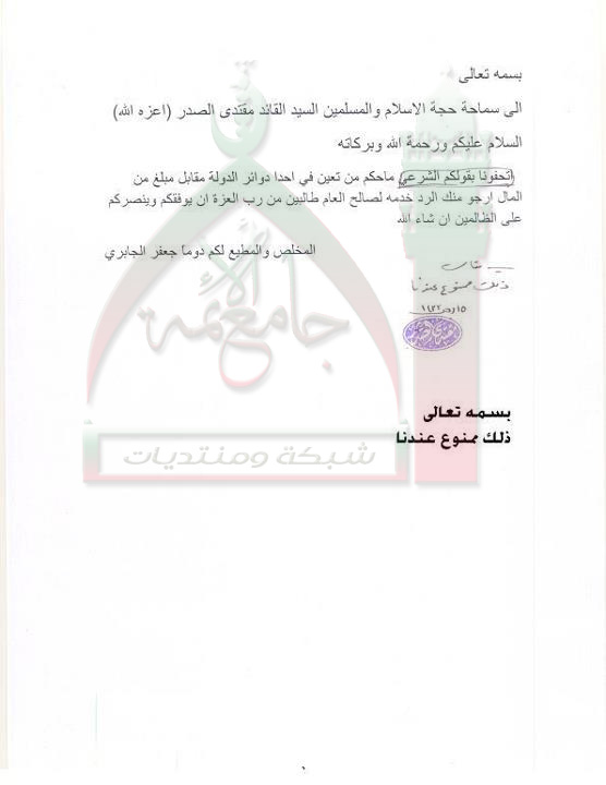 دفع مبالغ مالية لأجل التعيين استفتاء السيد القائد مقتدى الصدر اعزه الله 6 - 6 - 2012