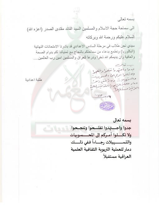 طلب دعاء لطلبة المرحلة السادس الإعدادي بمناسبة بدء الامتحانات استفتاء السيد القائد مقتدى الصدر اعزه الله 7 - 6 - 2012