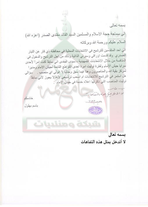 الترشيح في الإنتخابات لمن كان متوليا لمناصب في جيش المهدي استفتاء السيد القائد مقتدى الصدر اعزه الله 7 - 6 - 2012