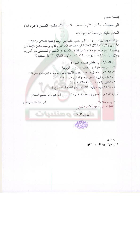 اسباب ارتفاع نسبة الطلاق في المجتمع استفتاء السيد القائد مقتدى الصدر اعزه الله 9 - 6 - 2012