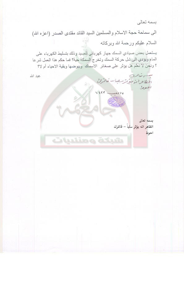 استعمال جهاز كهربائي لصيد الاسماك استفتاء السيد القائد مقتدى الصدر اعزه الله 9 - 6 - 2012