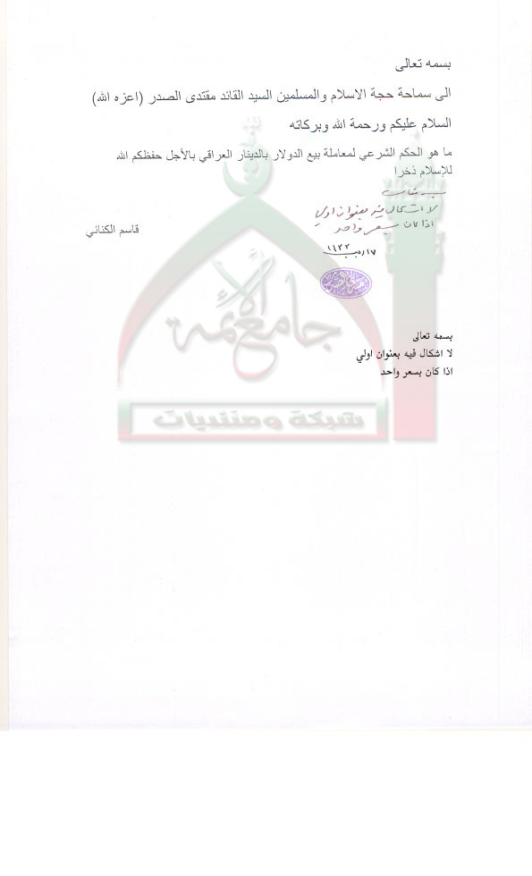 بيع الدولار بالدينار بالاجل استفتاء السيد القائد مقتدى الصدر اعزه الله 9 - 6 - 2012