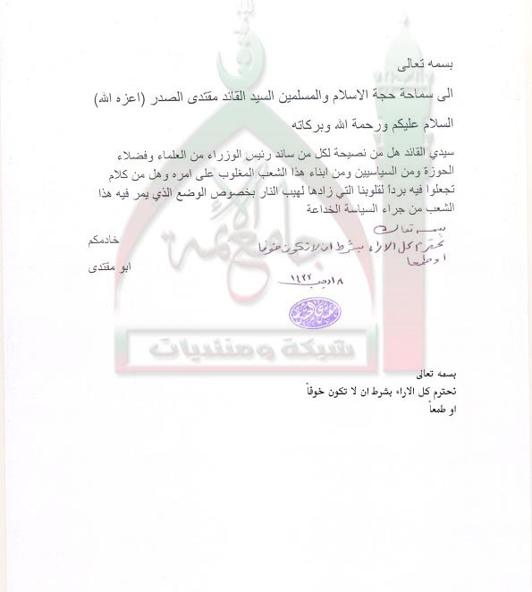 طلب اعطاء النصيحة لكل من ساند رئيس الوزراء ووقف معه استفتاء السيد القائد مقتدى الصدر اعزه الله 9 - 6 - 2012
