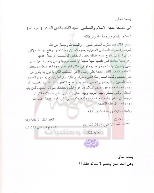 المجالس الحسينية وتسيسها الى الاحزاب في الاونة الاخيرة استفتاء السيد القائد مقتدى الصدر اعزه الله 9 - 6 - 2012