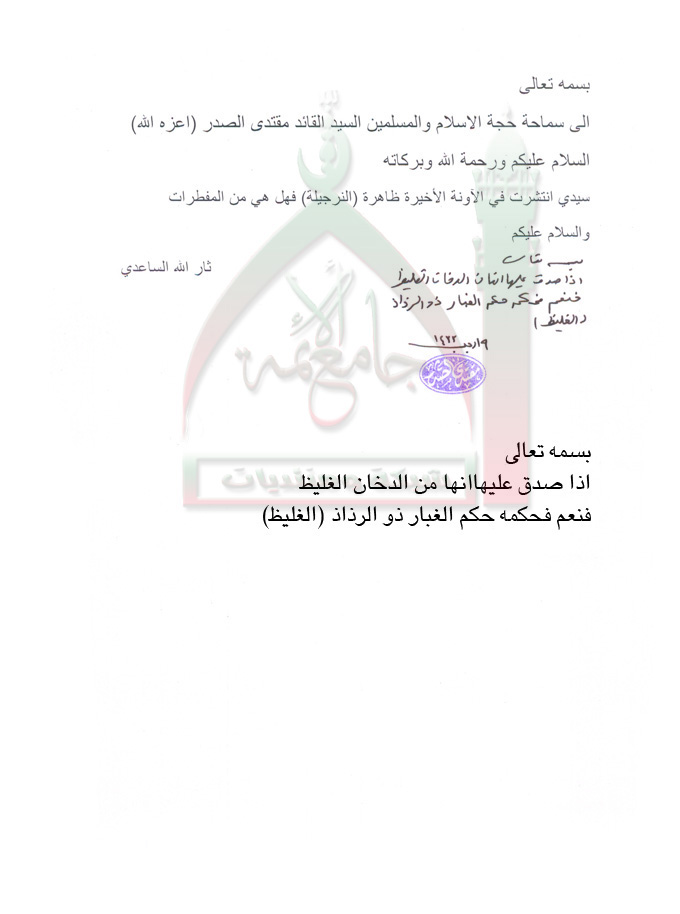 النركيلة وكونها من المفطرات ام لا استفتاء السيد القائد مقتدى الصدر اعزه الله 10 - 6 - 2012
