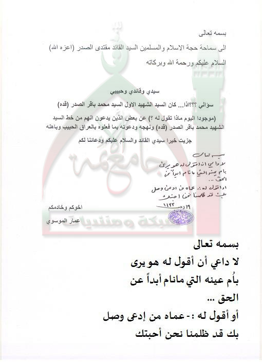 لو كان السيد الشهيد الاول محمد باقر الصدر قدس سره موجودا ما كان سماحته ليقول له ؟ استفتاء السيد القائد مقتدى الصدر اعزه الله 10 - 6 - 2012