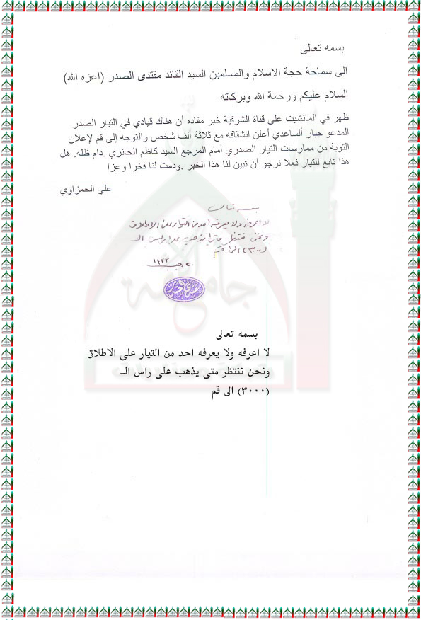 المدعو جبار الساعدي لا يعرفه احد من التيار على الاطلاق استفتاء السيد القائد مقتدى الصدر اعزه الله 11 - 6 - 2012