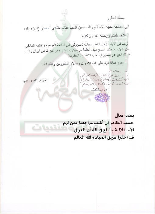 سحب الثقة ومواقف المراجع بهذا الخصوص استفتاء السيد القائد مقتدى الصدر اعزه الله 11 - 6 - 2012
