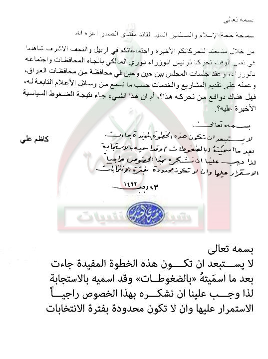 كثرة الضغوطات السياسية على المالكي جعلته يتحرك نحو المحافظات واجتماعه بالوزراء استفتاء السيد القائد مقتدى الصدر اعزه الله 13 - 6 - 2012