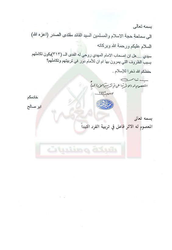 تكامل اصحاب الامام المهدي ودور الامام المهدي ع في تربيتهم وتكاملهم استفتاء السيد القائد مقتدى الصدر اعزه الله 15 - 6 - 2012