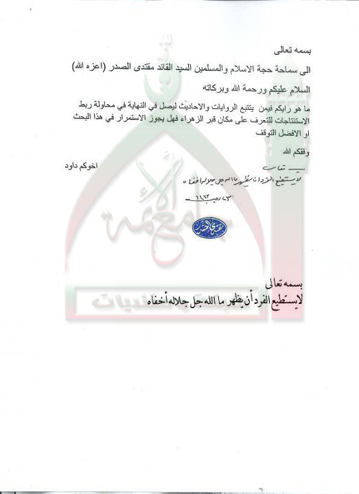 خفاء قبر الزهراء عليها السلام استفتاء السيد القائد مقتدى الصدر اعزه الله 15 - 6 - 2012