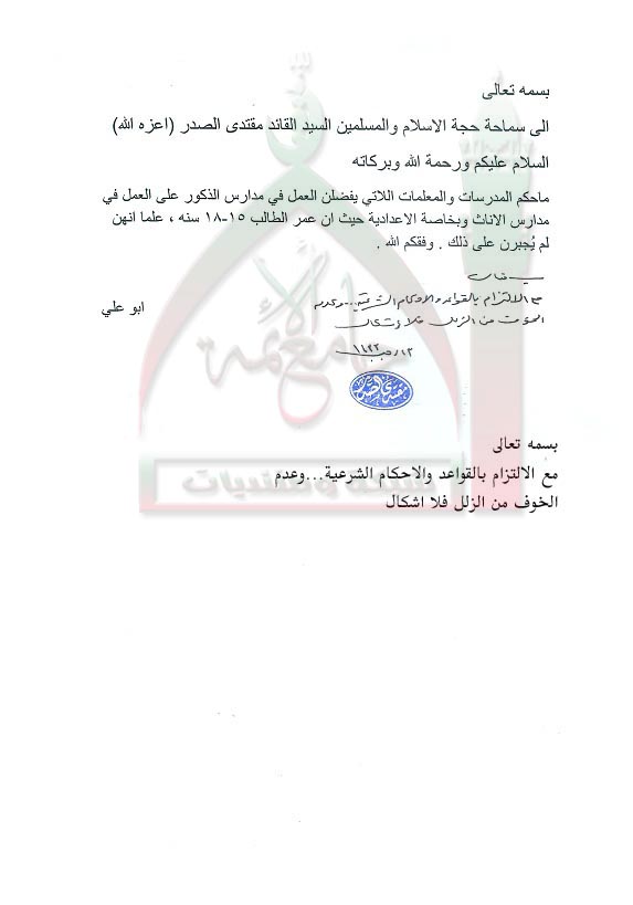 المدرسات والمعلمات اللاتي يفضلن العمل في مدارس الذكور على العمل في مدارس الاناث استفتاء السيد القائد مقتدى الصدر اعزه الله 15 - 6 - 2012