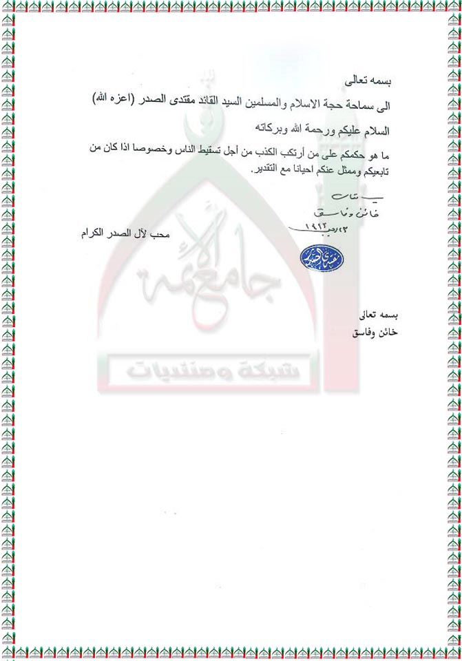 تسقيط الناس بالكذب استفتاء السيد القائد مقتدى الصدر اعزه الله 16 - 6 - 2012