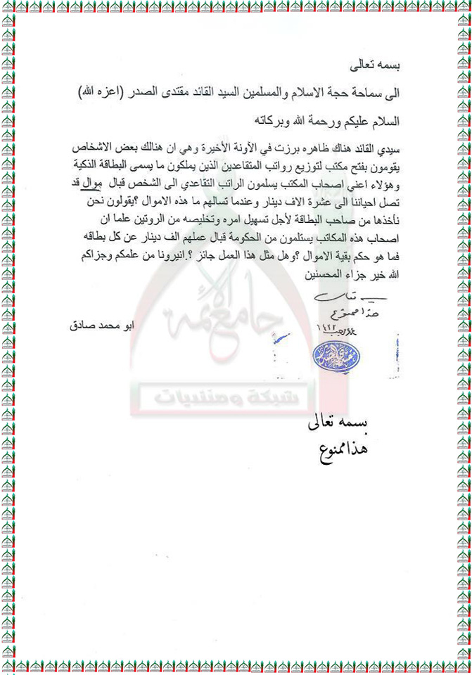 اخذ اموال زيادة عن المحدد من قبل اصحاب مكاتب توزيع الرواتب التقاعدية البطاقة الذكية استفتاء السيد مقتدى الصدر اعزه الله 16 - 6 - 2012