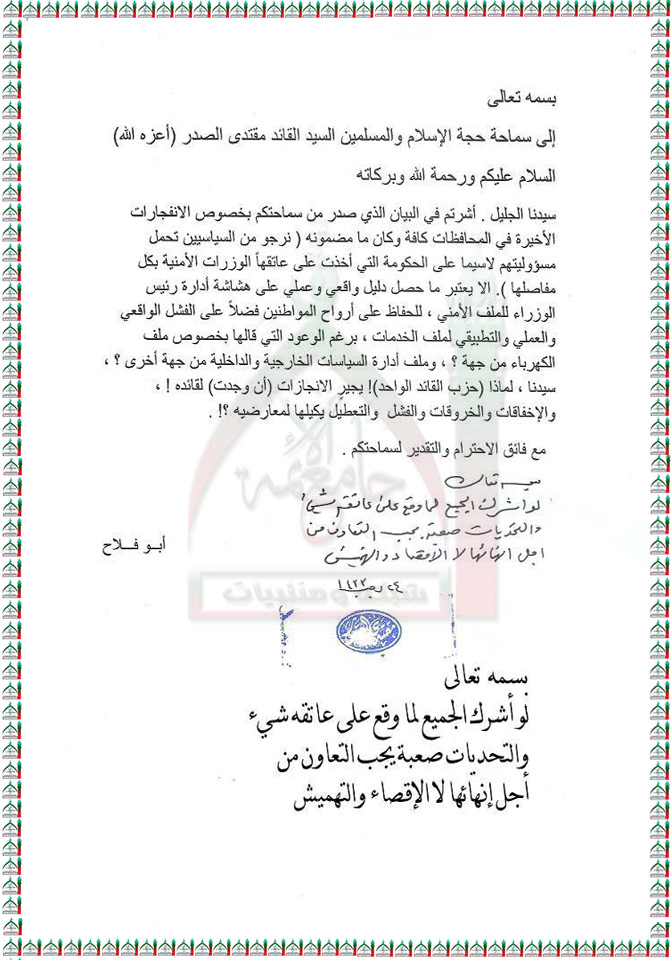 الاقصاء والتهميش وانعدام الشراكة من اسباب هشاشة ادارة رئيس الوزراء للملف الامني استفتاء السيد مقتدى الصدر اعزه الله 16 - 6 - 2012