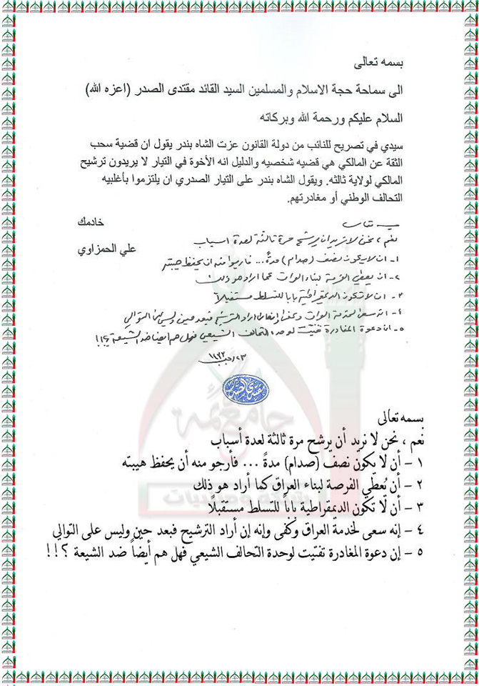 اسباب عدم الموافقة على ترشيح المالكي لولاية ثالثة استفتاء السيد مقتدى الصدر اعزه الله 16 - 6 - 2012