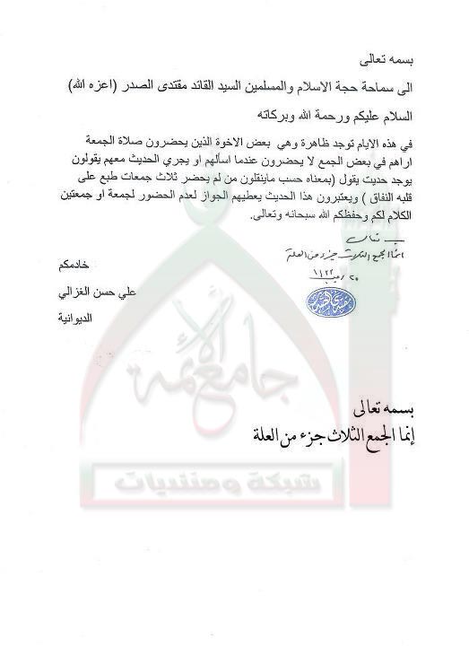 عدم حضور بعض الجمع بحجة الحديث من لم يحضر ثلاث جمع طبع على قلبه النفاق استفتاء السيد مقتدى الصدر اعزه الله 17 - 6 - 2012