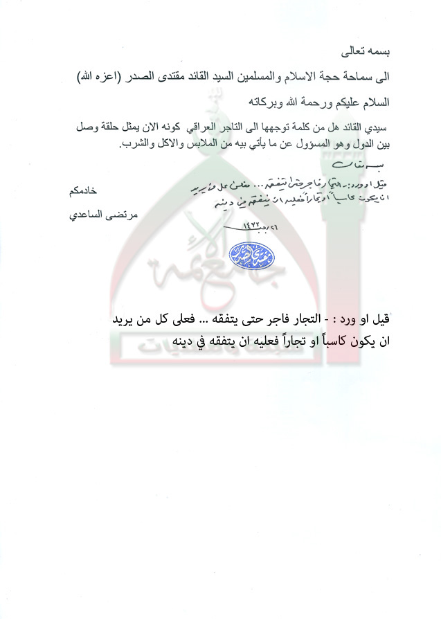 كلمة الى التاجر العراقي استفتاء السيد القائد مقتدى الصدر اعزه الله 18 - 6 - 2012