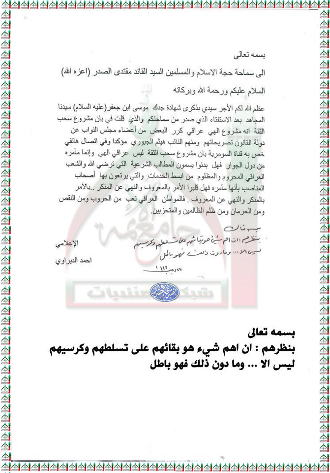 تصريح النائب عن دولة القانون هيثم الجبوري حول المشروع الالهي العراقي لسحب الثقة استفتاء السيد القائد مقتدى الصدر اعزه الله 19 - 6 - 2012