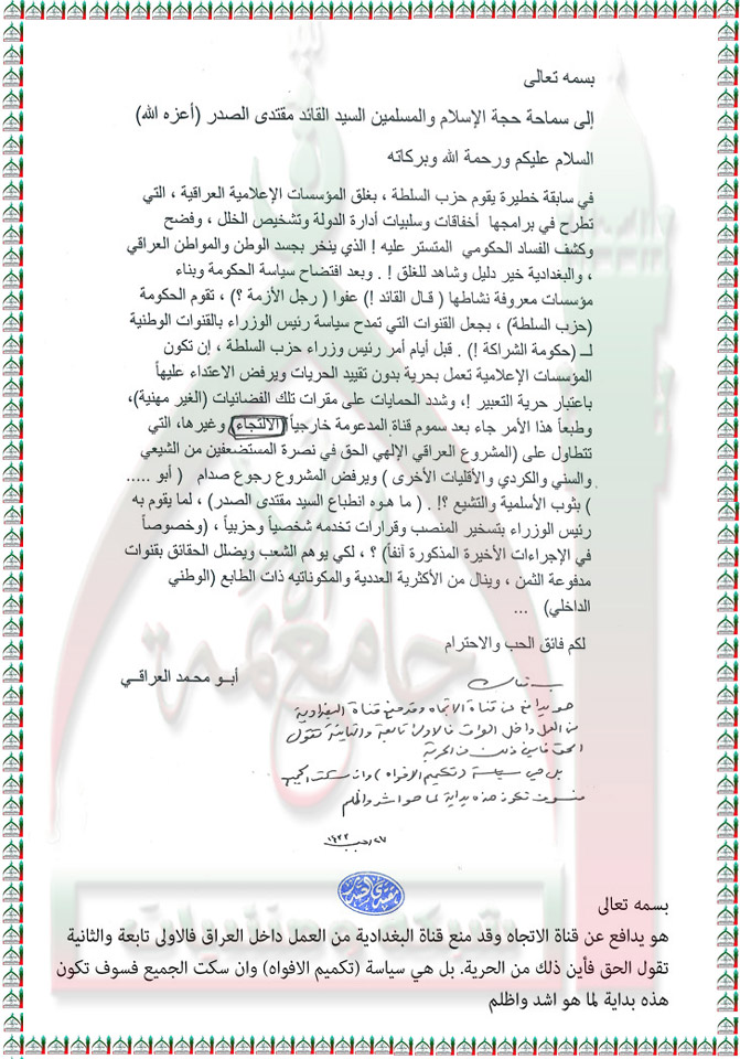 سياسة تكميم الأفواه التي تتخذها الحكومة العراقية ضد بعض القنوات الفضائية استفتاء السيد القائد مقتدى الصدر اعزه الله 19 - 6 - 2012