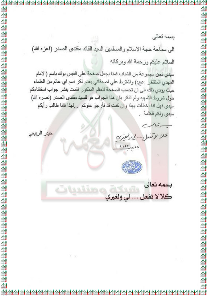 فتح صفحة في الفيس بوك بإسم الإمام المهدي عليه السلام استفتاء السيد القائد مقتدى الصدر اعزه الله 20 - 6 - 2012