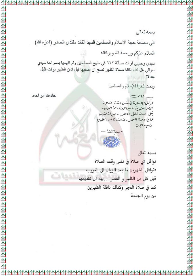 مسألة نافلة صلاة الظهر الموجودة في منهج الصالحين استفتاء السيد القائد مقتدى الصدر(اعزه الله) 21 -6 -2012