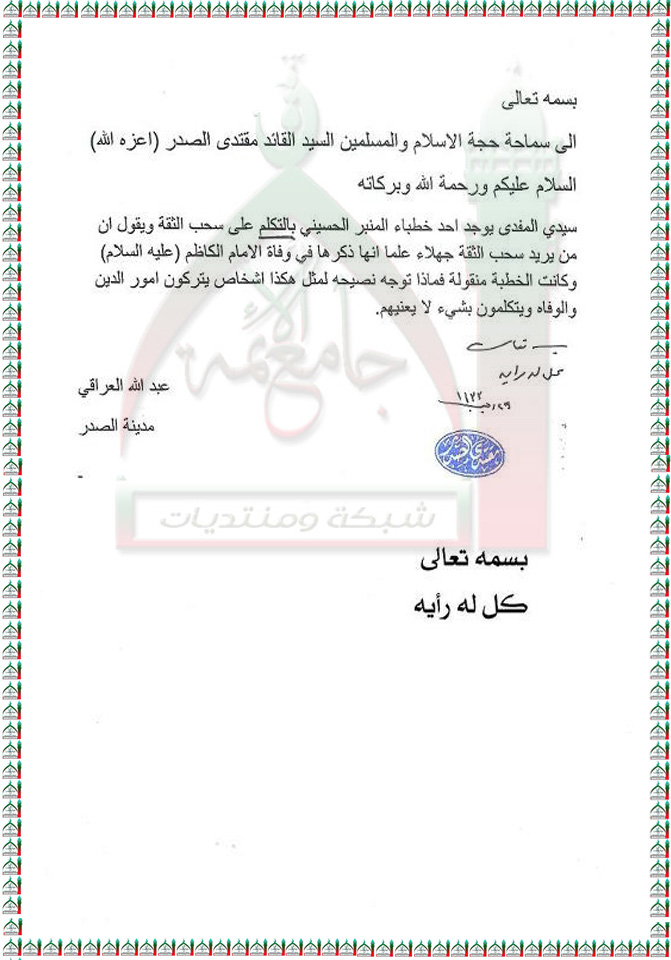 احد الخطباء الذي يتكلم عن سحب الثقة ويستنكر على المطالبين بها وذلك في ذكرى استشهاد الإمام الكاظم عليه السلام استفتاء السيد القائد مقتدى الصدر(اعزه الله) 21 -6 -2012