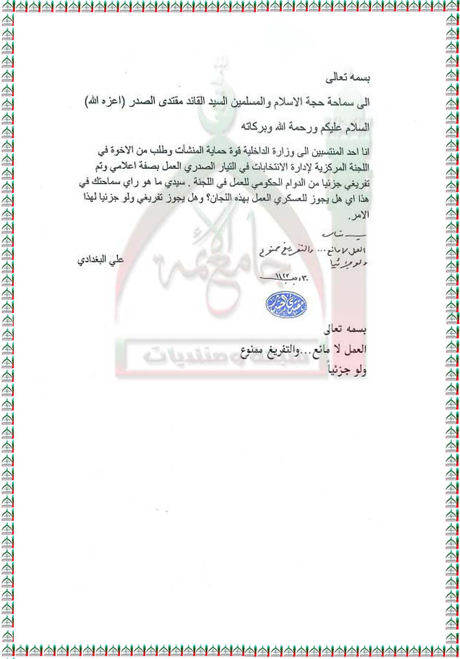 التفرغ من الدوام الحكومي للعمل في اللجنة المركزية للانتخابات الخط الصدري استفتاء السيد القائد مقتدى الصدر اعزه الله 22 - 6 - 2012
