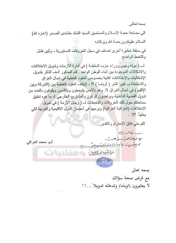 اشراك اوباما بالشؤون الداخلية العراقية من قبل رئيس الوزراء العراقي كتدويلا للخلافات العراقية كعقود النفط مثلا استفتاء السيد القائد مقتدى الصدر اعزه الله 23 - 6 - 2012