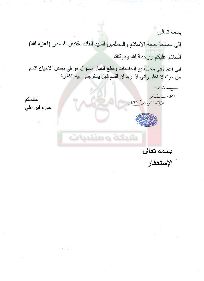 قسم العامل الذي يعمل في محل لبيع الحاسبات وهو غير راغب فيه استفتاء السيد القائد مقتدى الصدر اعزه الله 23 - 6 - 2012