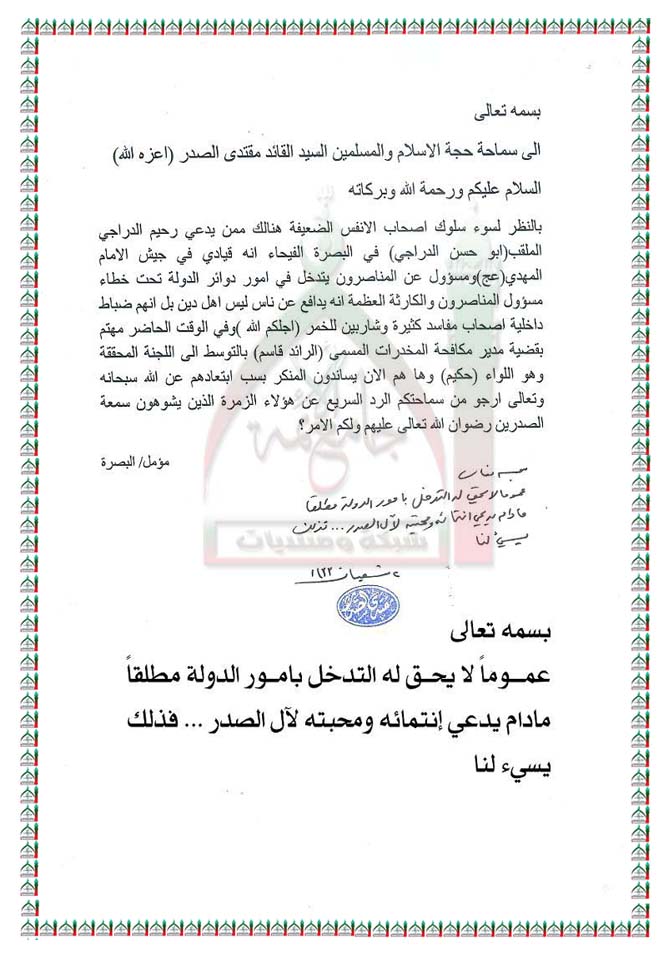 المدعو رحيم الدراجي الملقب أبو حسن الدراجي في محافظة البصرة وتدخله بأمور الدولة استفتاء السيد القائد مقتدى الصدر اعزه الله 24 -6 - 2012