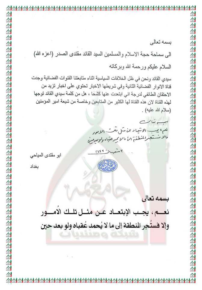 وجوب ابتعاد قناة الانوار الثانية عن بث الامور الطائفية في الشريط الاخباري استفتاء السيد مقتدى الصدر اعزه الله 25 - 6 - 2012