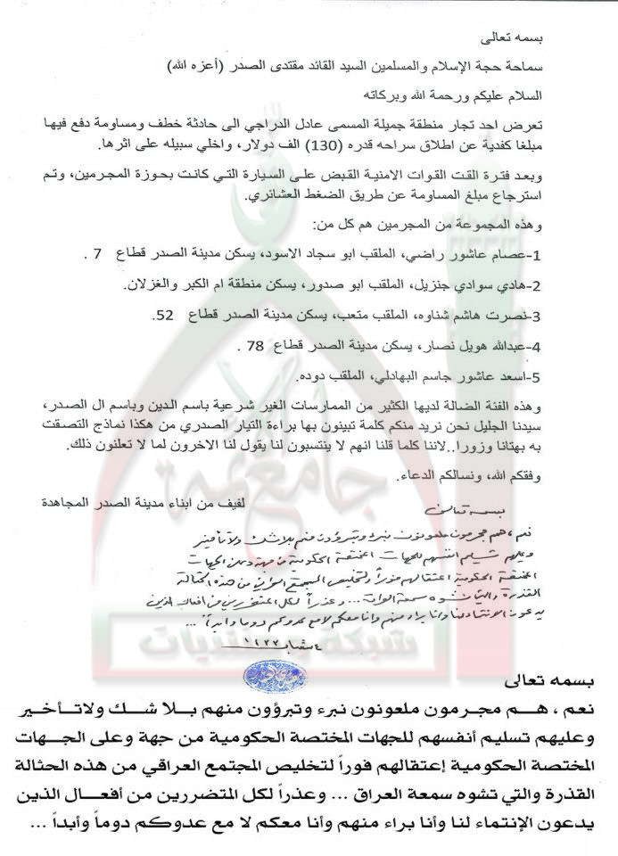 البراءة من مجموعة من المجرمين الذين يقومون بأختطاف ومساومة تجار جميلة استفتاء السيد مقتدى الصدر اعزه الله 26 - 6 - 2012