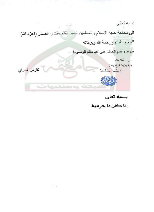 تأثير حبر القلم الجاف على الوضوء استفتاء السيد مقتدى الصدر اعزه الله 27 - 6 - 2012