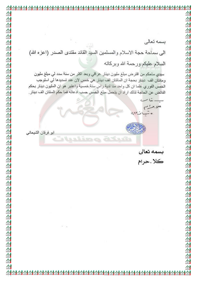 مسألة شرعية بخصوص الخمس استفتاء السيد مقتدى الصدر اعزه الله 27 - 6 - 2012