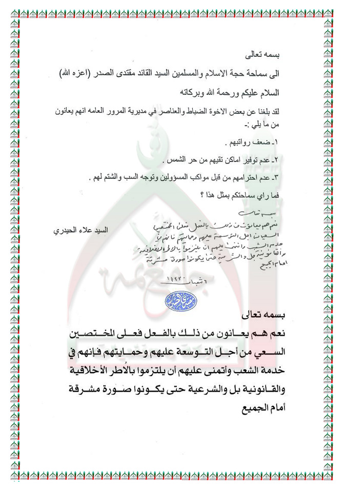 معاناة الضباط والمنتسبين في مديرية المرور العامة من ضعف الرواتب وغيرها استفتاء السيد مقتدى الصدر اعزه الله 28 - 6 - 2012