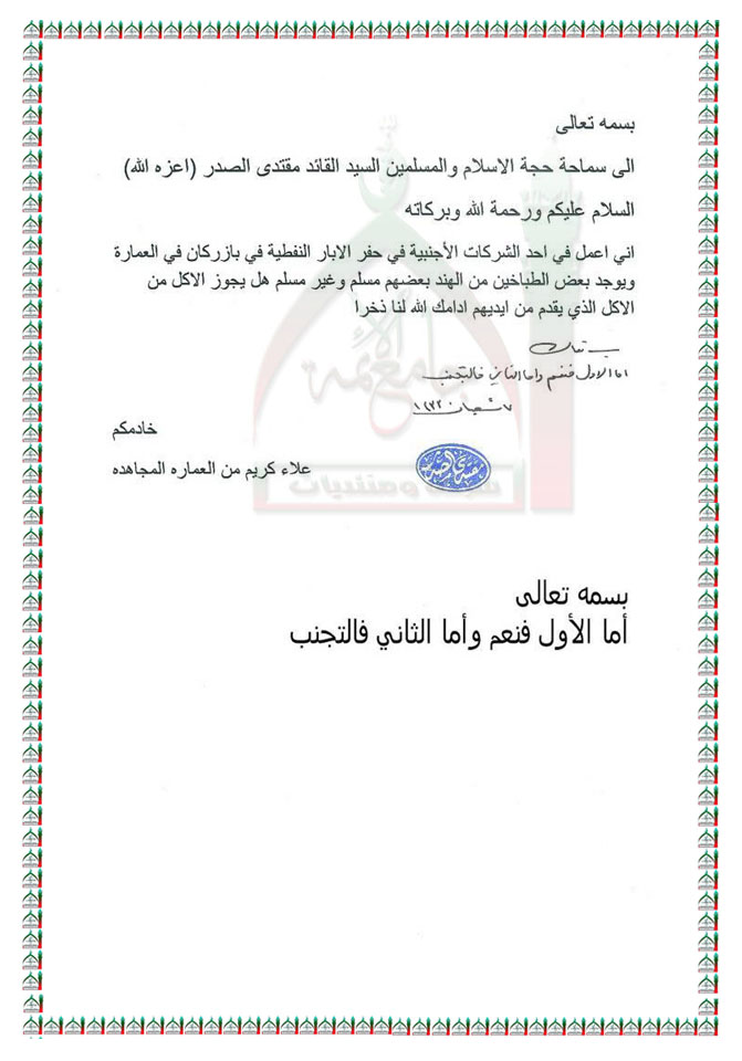 هل يجوز تناول الاكل الذي يقدمه بعض الطباخين من الهند وبعضهم من المسلمين استفتاء السيد مقتدى الصدر 29-6-2012
