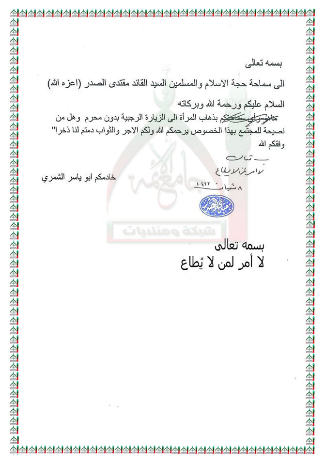 ذهاب المراة الى الزيارة الرجبية بدون محرم استفتاء السيد القائد مقتدى الصدر 30-6-2012