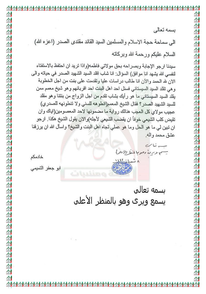 رفض تزويج شاب صدري من قبل احد المعممين استفتاء السيد القائد مقتدى الصدر 30-6-2012