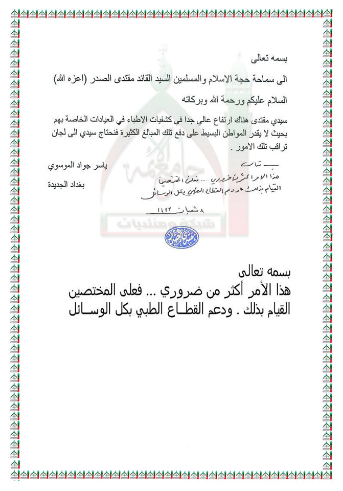 ارتفاع اسعار كشفيات الاطباء استفتاء السيد القائد مقتدى الصدر 30-6-2012
