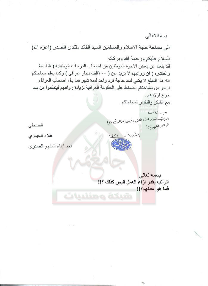 معاناة وقلة رواتب اصحاب الدرجات الوظيفية التاسعة والعاشرة استفتاء السيد مقتدى الصدر اعزه الله 1 - 7 - 2012