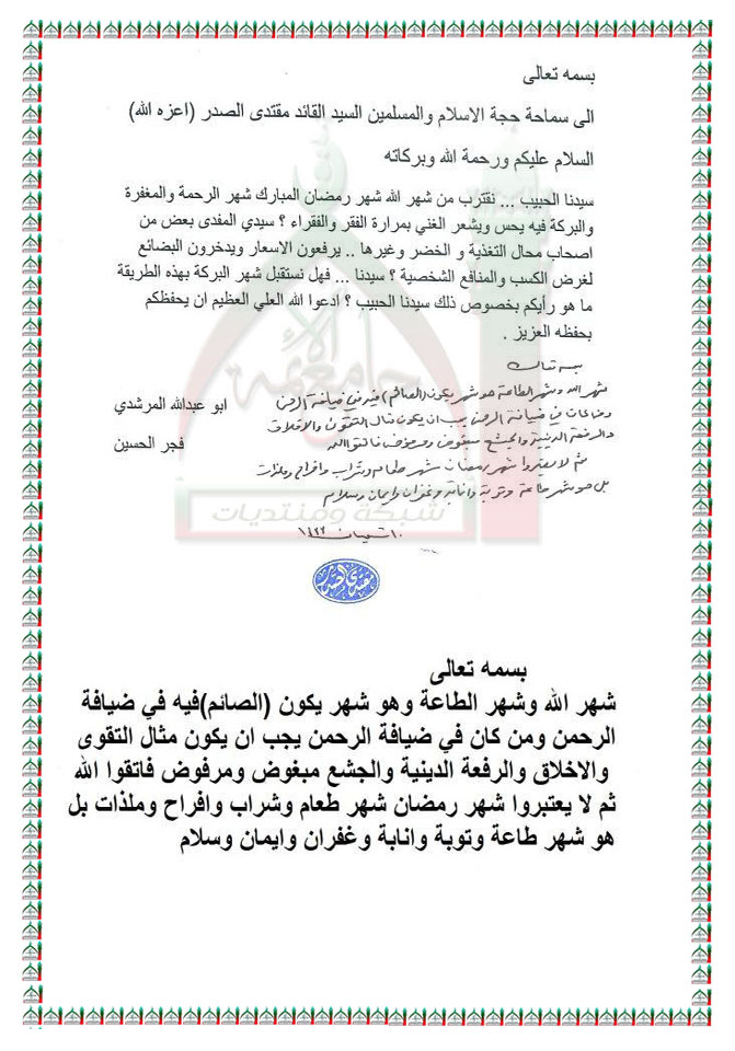الجشع ورفع اسعار الأطعمة في شهر رمضان الكريم استفتاء السيد القائد مقتدى الصدر 2 - 7 - 2012
