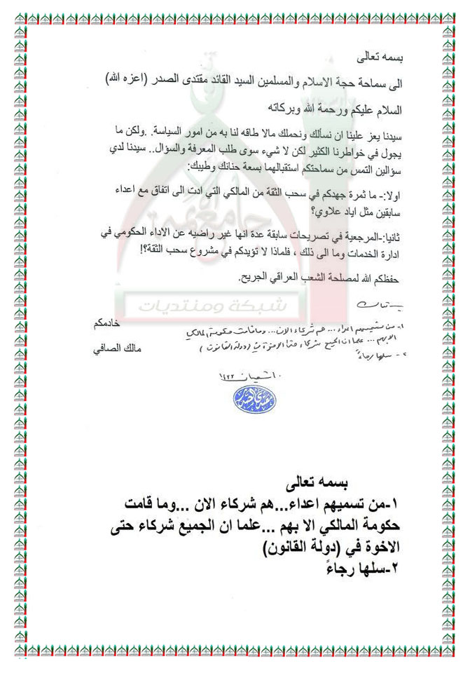 سحب الثقة عن الحكومة ورأي المرجعية استفتاء السيد القائد مقتدى الصدر 2 - 7 - 2012