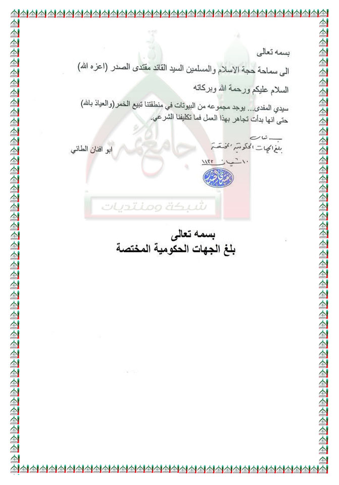 بيع الخمور في البيوت استفتاء السيد القائد مقتدى الصدر 2 - 7 - 2012