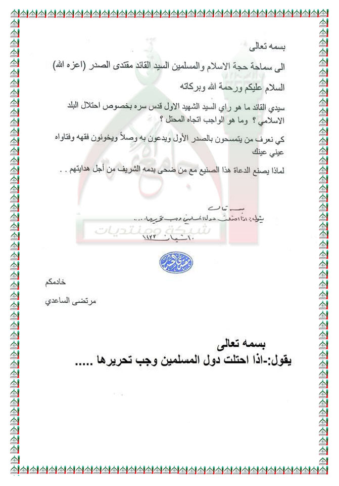 رأي السيد الشهيد محمد باقر الصدر في احتلال البلد الاسلامي استفتاء السيد القائد مقتدى الصدر 2 - 7 - 2012