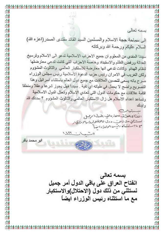 اقامة العلاقات مع حكومات الدول التي تعادي الاسلام و تحتل البلاد الاسلامية استفتاء السيد القائد مقتدى الصدر اعزه الله 3 - 7 - 2012