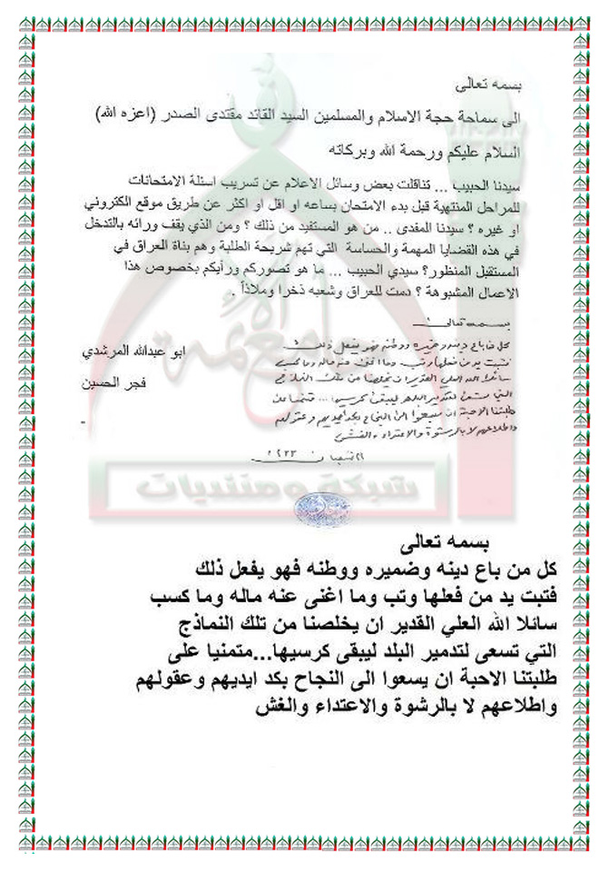 تسريب اسئلة الامتحانات للصفوف المنتهية قبل موعد الامتحان بساعة استفتاء السيد القائد مقتدى الصدر اعزه الله 3 - 7 - 2012
