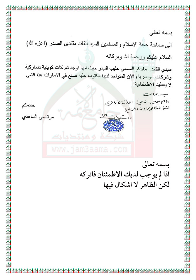 حكم تناول حليب النيدو الموجود باسماء شركات كويتية ودنماركية وسويسرية استفتاء السيد مقتدى الصدر اعزه الله 4 - 7 - 2012