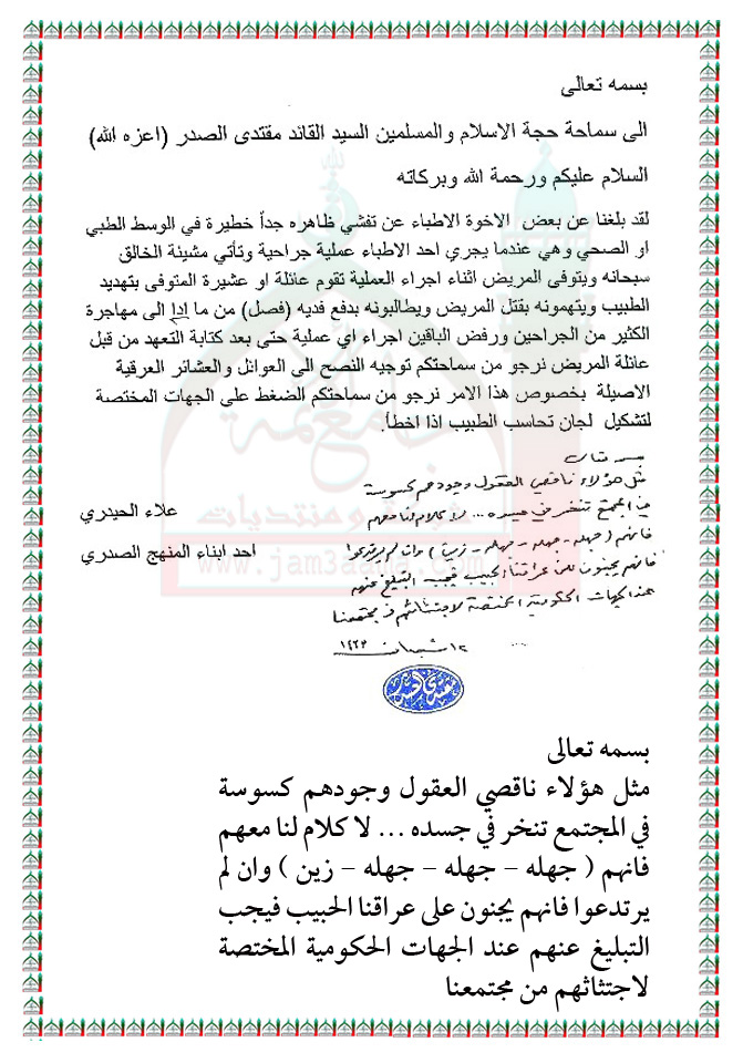 تهديد الاطباء بدفع الفدية في حال فشل العمليات الجراحية مما يؤدي الى هجرتهم استفتاء السيد مقتدى الصدر اعزه الله 4 - 7 - 2012